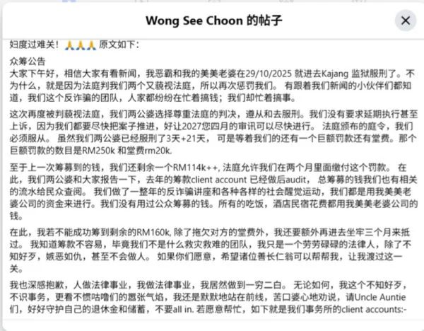 在接受《中国报》采访时,傅协祥表示,上一轮筹款还剩下11万4000令吉,他现在还需要筹集16万令吉,否则将面临额外的3个月监禁。他补充道,上一个筹款账户中,有一笔资金是专门用于资助那些无法负担诉讼费用的被告,这笔资金已通过审计,并对外公开了相关资金流向。