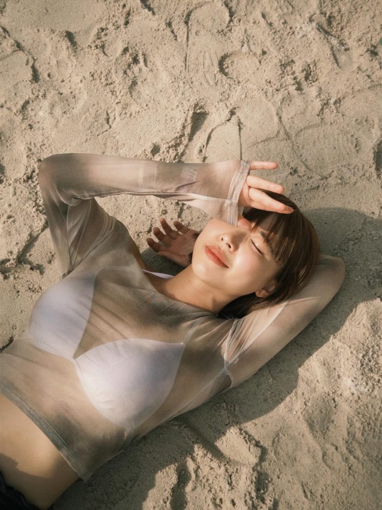 照片中,“一隻阿圓”身穿白色比基尼,外搭一件透视薄罩衫,丰满上围和深邃事业线若隐若现,魅力十足。她时而脱下罩衫在水边嬉戏,搭配深色短裤,展现出穠纤合度的双腿线条。