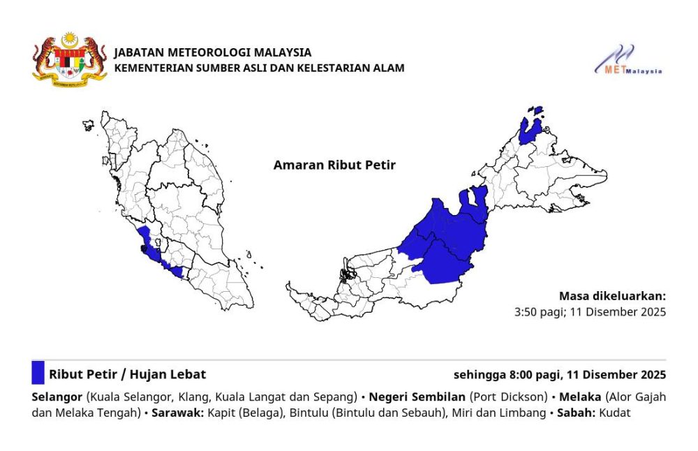 大马气象局今晨发出雷暴警报,指雪兰莪、森美兰、马六甲、砂拉越及沙巴部分地区预计将出现雷暴、豪雨及强风天气,警报有效至今天(12月11日,周四)早上8时。