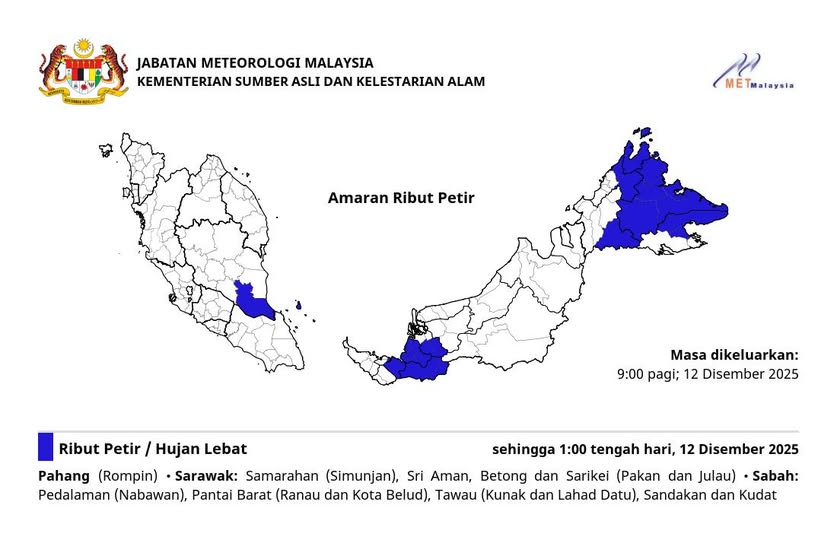 马来西亚气象局发布雷暴警告 (AMARAN RIBUT PETIR),预计以下地区将出现雷暴、豪雨和强风,直至 2025 年 12 月 12 日(星期五)中午 1:00