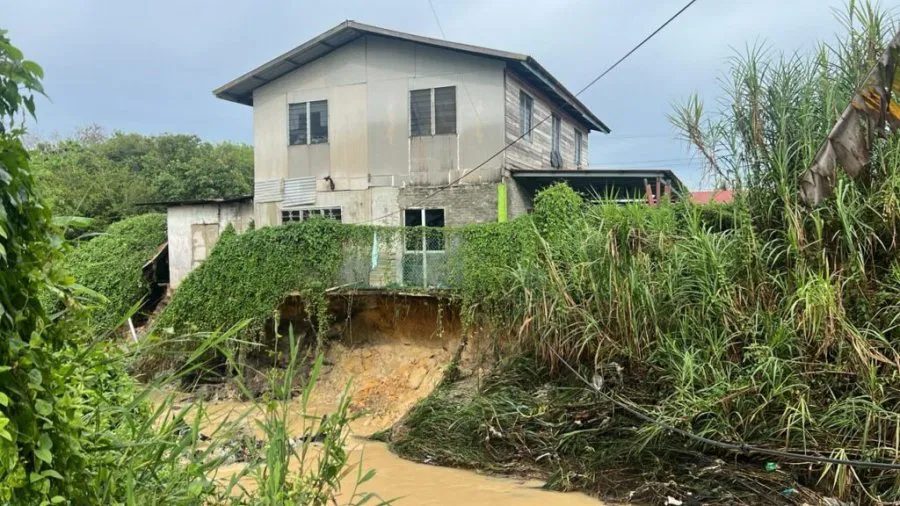 不料,今日(星期五)清晨约7时,对面工业店老板娘来电通知,屋后地基已全面崩塌。原本距离水沟约10至12尺的土地整片滑落,篱笆、洗衣机及洗手盘全数坠入水沟,屋墙出现明显裂痕,底部泥土严重流失,房屋部分悬空,随时可能倒塌。