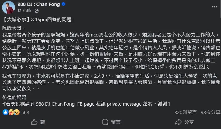 一名大马女子近日在电台988 DJ陈峰的脸书专页匿名投稿,倾诉家庭经济压力与丈夫健康状况,却引发网友激烈讨论,不少人批评她对罹患第四期癌症的丈夫“不近人情”。