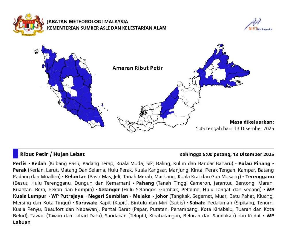 马来西亚气象局发布雷暴警告 (AMARAN RIBUT PETIR),预计以下地区将出现雷暴、豪雨和强风,直至 2025 年 12 月 13 日(星期六)下午 5:00。