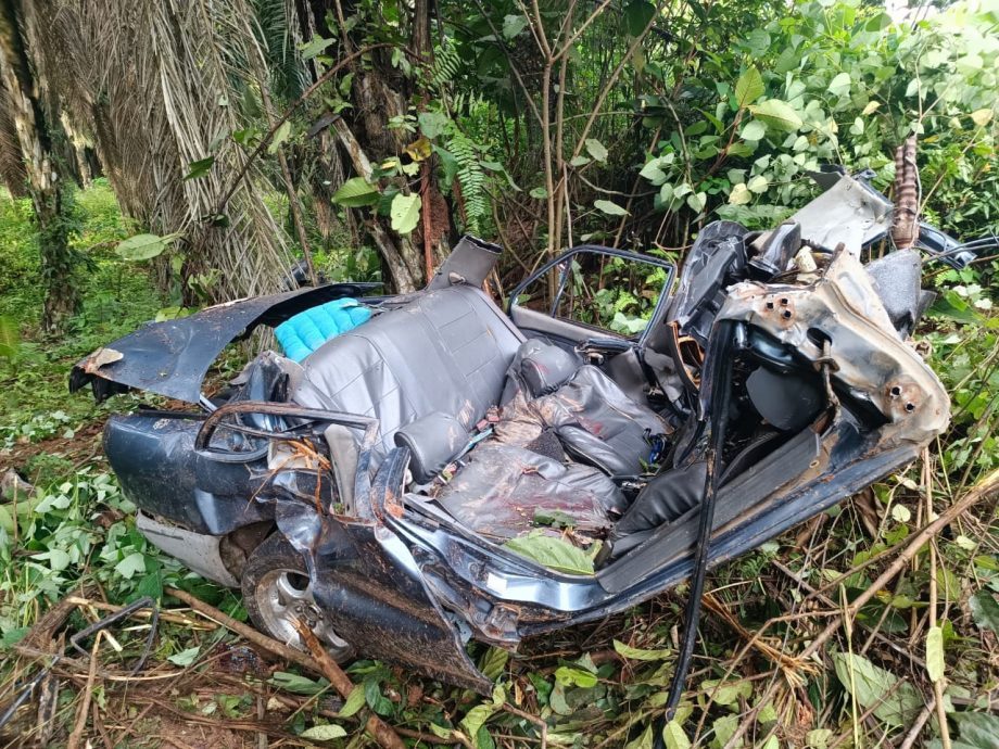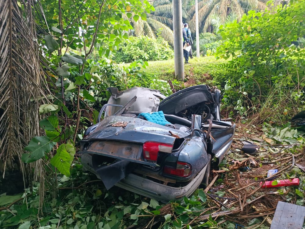马兰区今日发生一起恐怖车祸。一辆轿车失控猛烈撞击路旁油棕树,由于冲击力巨大,导致车头与车身完全分离,造成一名24岁的巫裔男子不幸当场死亡。