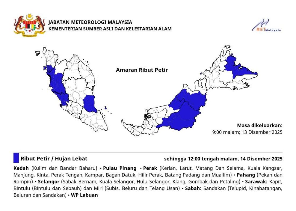 马来西亚气象局(METMalaysia)今日晚间9时正发出最新的“雷暴预警”(Amaran Ribut Petir),预料西马半岛多个州属和东马的砂拉越、沙巴及纳闽将持续面对雷暴、大雨及强风的威胁。