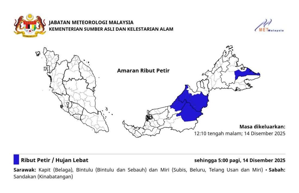 马来西亚气象局(MetMalaysia)于今日凌晨12时10分发布最新的“雷暴警报”(AMARAN RIBUT PETIR),预测东马的砂拉越和沙巴部分地区在凌晨时段将出现雷暴、大雨及强风。