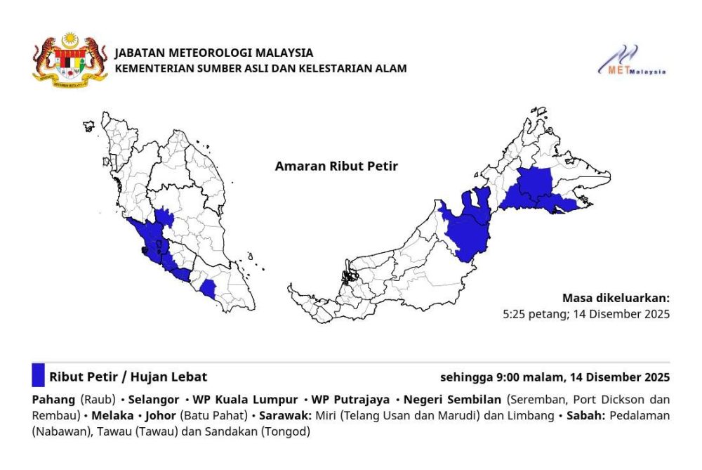 马来西亚气象局于2025年12月14日下午5:25发布雷暴警告,预计在今晚9点之前,多个州属将遭遇雷暴、暴雨及强风天气。