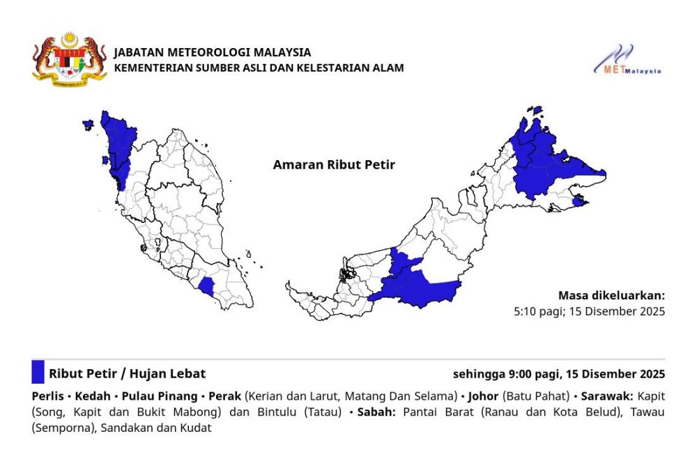 根据气象局于今日清晨5时10分发布的通告,受影响地区涵盖半岛与东马多地。半岛方面,包括玻璃市、吉打、槟城、霹雳州的吉辇、拉律、马登与司南马,以及柔佛州的峇株巴辖。