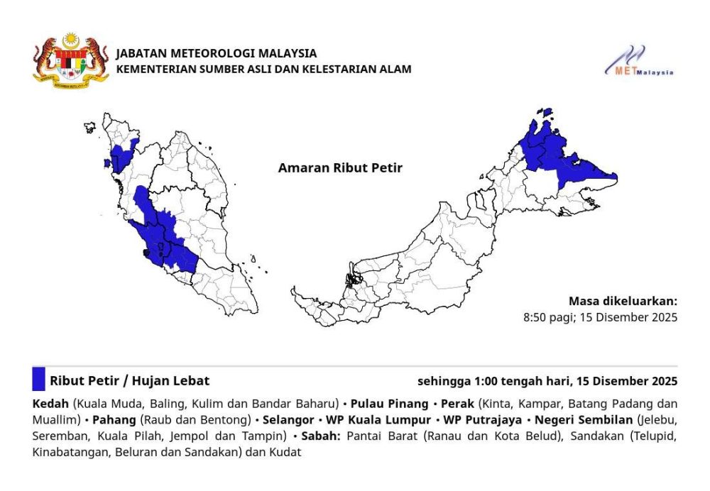 马来西亚气象局发布雷暴警告 (Thunderstorm Warning),预计以下州属和联邦直辖区的多个地区将出现雷暴和豪雨,直至 2025 年 12 月 15 日(星期一)下午 1:00。