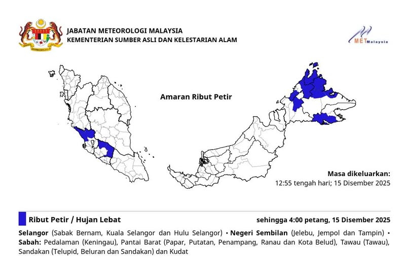 马来西亚气象局发布雷暴警告 (AMARAN RIBUT PETIR),预计以下州属的局部地区将出现雷暴、豪雨和强风,直至 2025 年 12 月 15 日(星期一)下午 4:00。