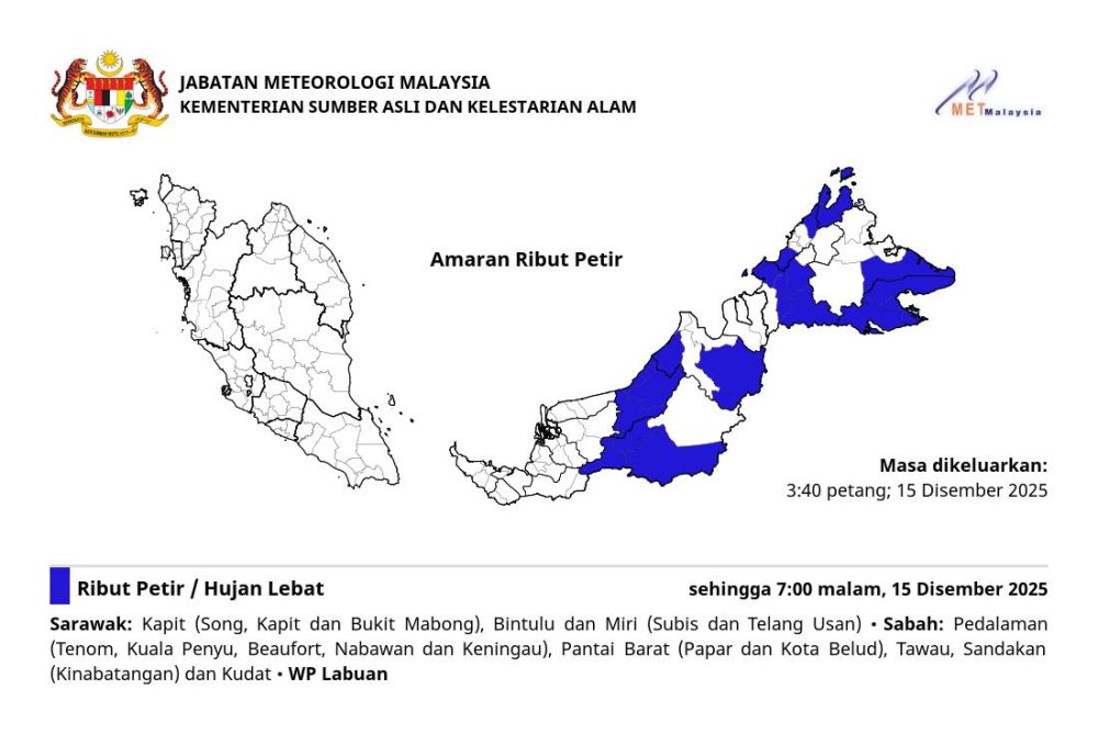 马来西亚气象局(MetMalaysia)于2025年12月15日下午3时40分发布最新的“雷暴警报”(AMARAN RIBUT PETIR),预测东马的砂拉越、沙巴及纳闽直辖区在傍晚时段将出现雷暴、大雨及强风。