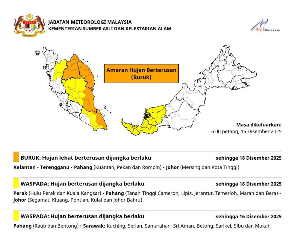 马来西亚气象局于2025年12月15日下午6点发布了持续暴雨的警告,预计恶劣天气将影响多个州,持续至2025年12月18日。