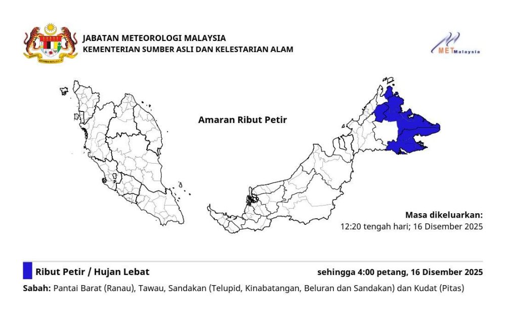 马来西亚气象局发布雷暴警告 (AMARAN RIBUT PETIR),预计沙巴以下地区将出现雷暴、豪雨和强风,直至 2025 年 12 月 16 日(星期二)下午 4:00。