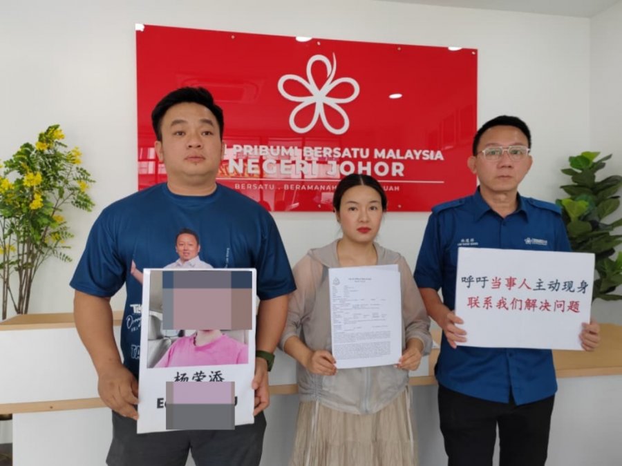 她今日在土著团结党非巫裔臂膀组织柔佛公共投诉与服务局主任林道祥及助理黄云杰陪同下召开记者会,呼吁杨姓男子现身,配合完成公司注销手续。