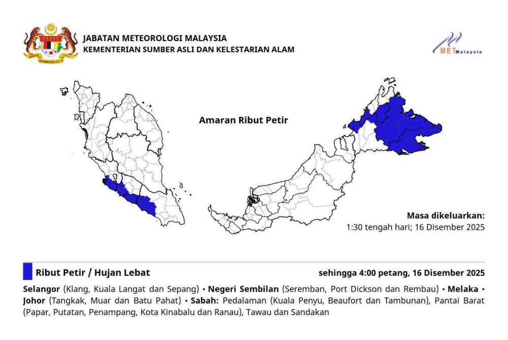 马来西亚气象局发布雷暴警告,预计以下地区将出现雷暴、豪雨及强风,天气情况预计将持续至 2025 年 12 月 16 日(星期二)下午 4:00。