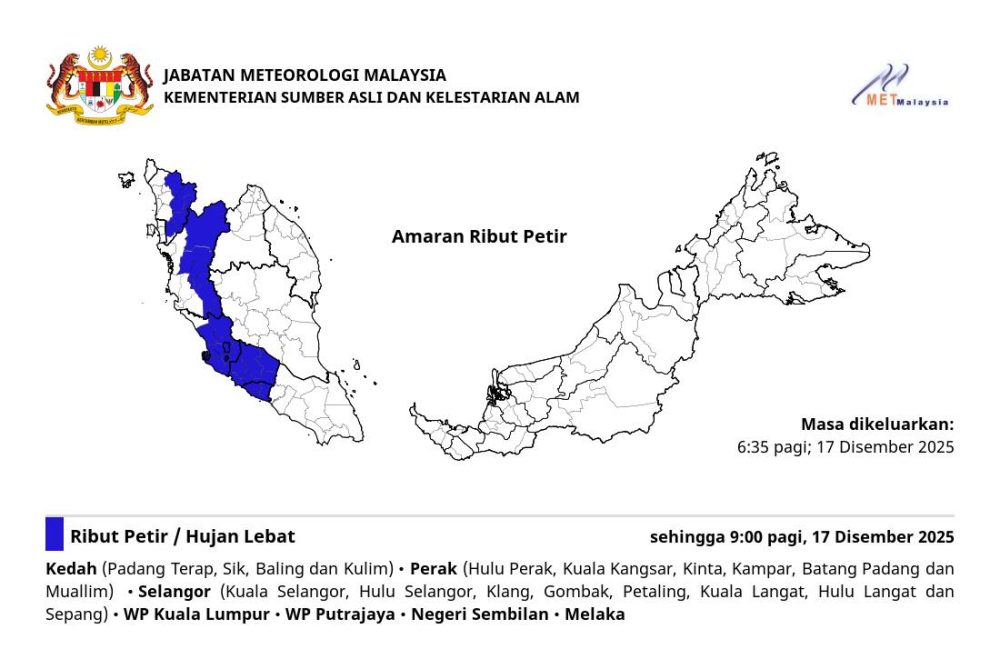 马来西亚气象局今早发布雷雨警报,警告国内多地将出现雷暴及短时强降雨天气,相关警报有效至今日上午9时。