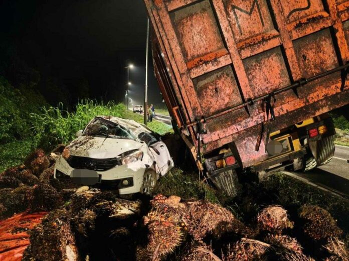砂拉越一辆白色轿车在超车过程中,意外追撞一辆满载油棕果的罗里,猛烈撞击导致两车双双失控。事故后,白色轿车倒转停在路旁,罗里则朝轿车方向倾倒,形成犹如“泰山压顶”的惊险场面,所幸轿车司机仅脚部轻微擦伤。