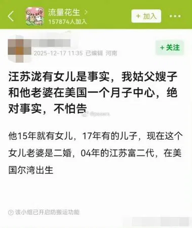 有网民爆料称,亲戚曾与汪苏泷“妻子”在美国同一间月子中心坐月子,指对方于2015年产下一名女儿,两年后再生一子,还声称女方是江苏富二代、二婚等细节,并放话“绝对属实,不怕被告”,语气强硬,一度让部分网友信以为真。