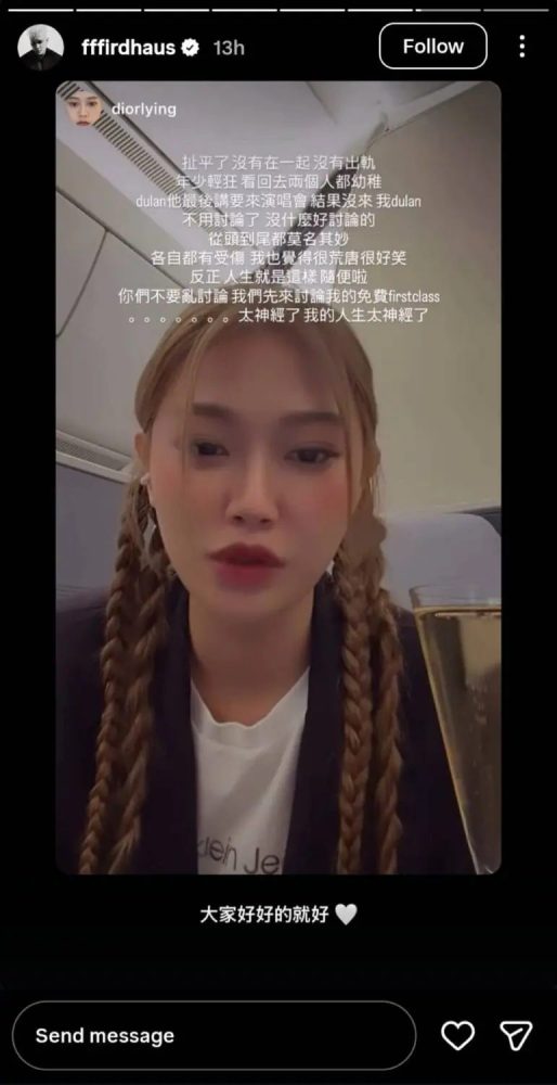 不久后,大颖再度透过限动说明,自己当时的不满仅源于菲道尔「放飞机」,原本答应出席演唱会却最终缺席。至于过往的分手争议,她表示双方当时都曾受伤,如今回看只觉得荒唐又好笑,也希望外界不必再过度解读或持续讨论。