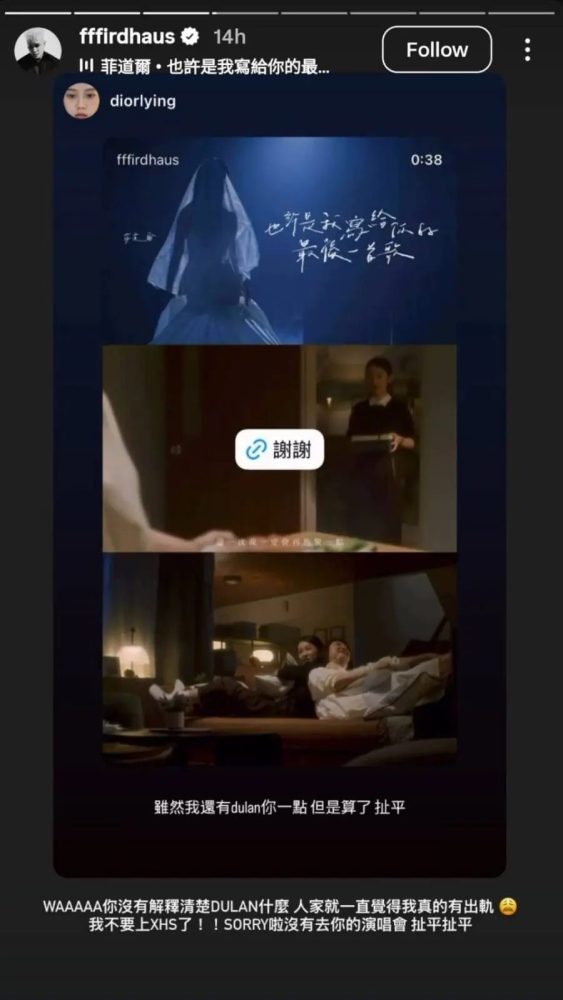 对此,菲道尔随后在 Instagram 限动回应,坦言大颖的留言让部分网友误会,并以轻松语气解释:「你没有解释清楚 dulan 什么,人家就一直觉得我真的出车九,我不要上 XHS 了。」他也顺带为自己未能出席相关演唱会一事致歉,双方隔空互动被外界解读为「扯平」收场。