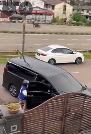 从视频画面可见,一辆黑色丰田Alphard突然撞向停放在住家前的一辆摩哆,摩哆上坐着一名华裔男子,撞击力道导致摩哆翻倒在地。