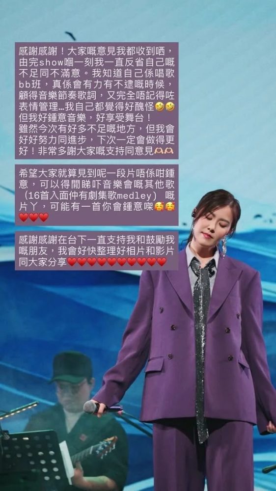 她于17日在 Instagram 限时动态发文表示,已收到不少观众的意见,音乐会结束后也不断反省自身不足。她直言自己仍属“唱歌 BB 班”,在舞台上往往顾着节奏与歌词,结果完全忽略了表情管理,“有时候真的会力有不逮……我自己也觉得很丑。”