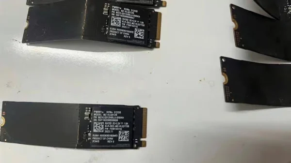 从照片可见,这批是三星PM991a 512GB的M.2 2280固态硬盘,多数都不同程度弯折。虽然没有完全断裂,但除非其中一些“幸运儿”核心电路未受损放入盒子或许还能用,否则基本难以恢复。