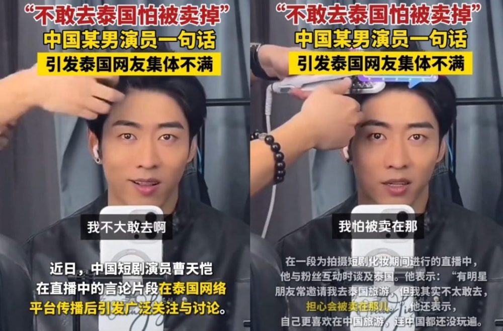 据《泰国头条新闻》报道,曹天恺在拍摄短剧、化妆期间开启直播与粉丝互动时谈及泰国。他透露,曾有演艺圈朋友多次邀请他到泰国旅游,但他坦言自己“不太敢去”,担心会“被卖掉”。随后他还自嘲称,自己出门时不太会多加思考,容易受骗,“如果有人跟我说有糖果要给我,我可能就会跟着走,或许10点下飞机,10点半人就不见了”。