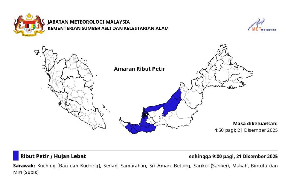 根据马来西亚气象局于21日清晨4时50分发布的最新通告,砂拉越多个地区出现雷暴及大雨天气,相关恶劣天气预计将持续至上午9时。