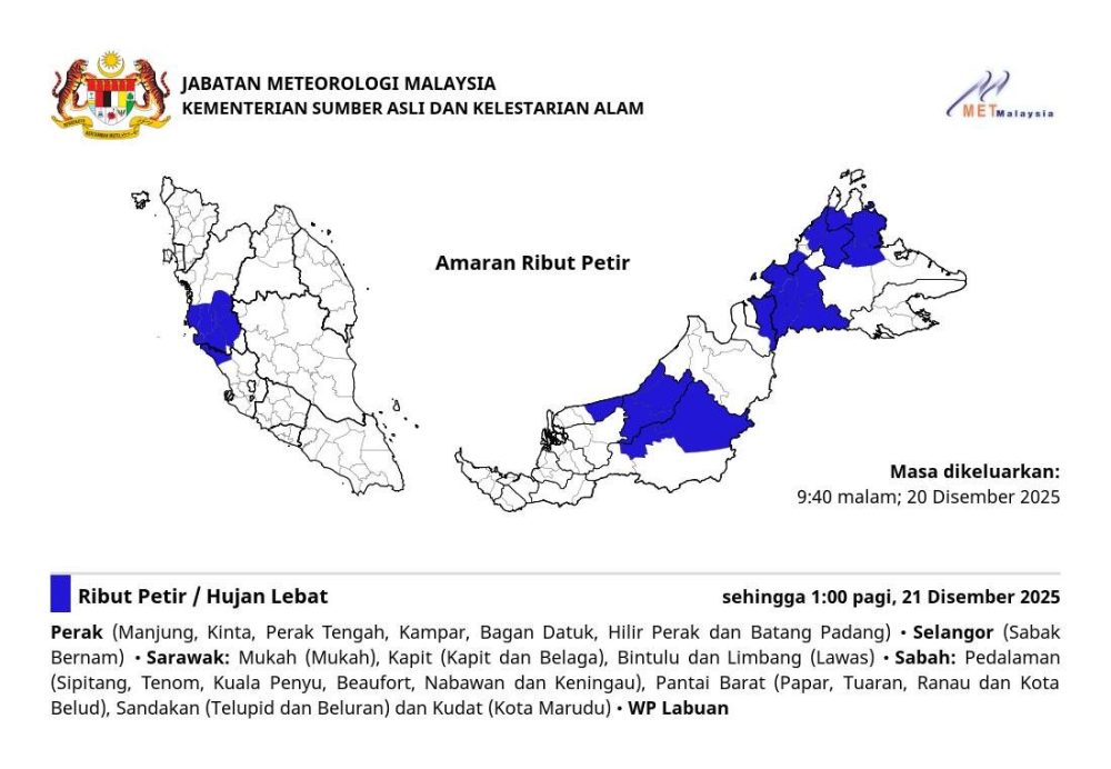 马来西亚气象局(MetMalaysia)今日发出雷暴警告,预计接下来的几个小时内,多个州属将出现强烈的雷暴天气,并伴有大雨和强风。