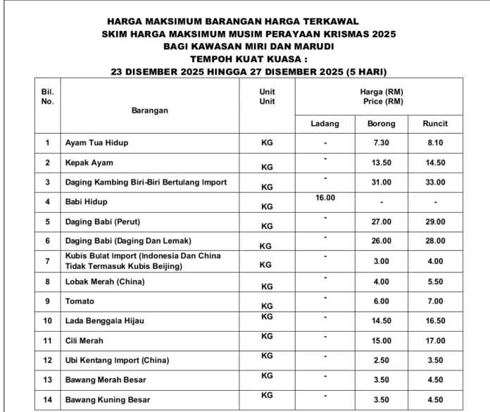 该局在文告中指出,统制措施适用于美里及马鲁帝,主要目的是在圣诞节前后稳定高需求食品价格,保障消费者权益。