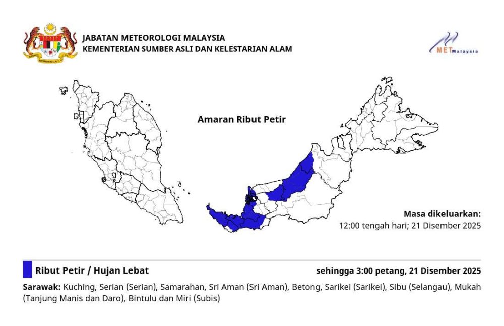 气象局发布警报,预计砂拉越多地将出现雷暴、强降雨及大风天气,受影响地区包括:古晋、实仁(Serian)、三马拉汉、斯里阿曼、勿洞、诗巫(实兰沟)、泗里街、沐胶(丹绒马尼与达罗)、民都鲁及美里(苏必士)。有关恶劣天气预计将持续至2025年12月21日(星期日)下午3时。