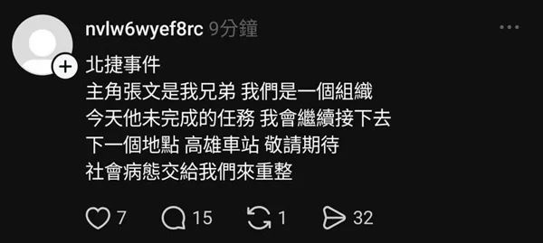 台湾台北车站及南西商圈日前发生随机持刀攻击事件,凶手张文在砍伤3人后坠楼身亡。事后,社交平台Threads出现贴文声称“主角张文是我兄弟,下一个地点是高雄车站”,引发社会恐慌。桥头地检署已指挥调查局逮捕一名陈姓男大学生,但调查显示,陈男仅为转贴者,真正的原始发文者仍在追查中。