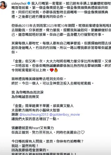 她同时贴出多年前与张继聪一同出席金像奖颁奖礼的合照,回忆当年入行拍摄的第一部电影便与对方合作,多年来一直得到这位前辈的鼓励与支持,字里行间尽显对演艺工作的热情与感激。