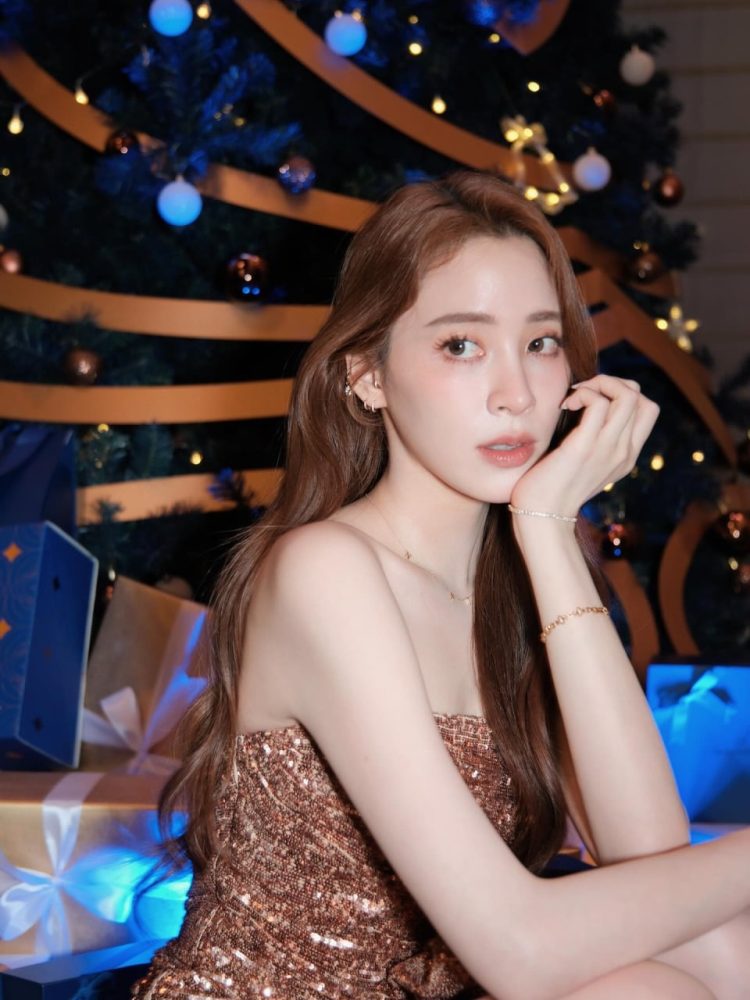欧阳妮妮在IG贴文中展示派对造型:一头长发自然垂落,身穿平口短裙礼服,香肩若隐若现,修长美腿更是吸睛。礼服上的亮片点缀增添光彩,也衬托出她高雅气质,完全看不出已经是人母。