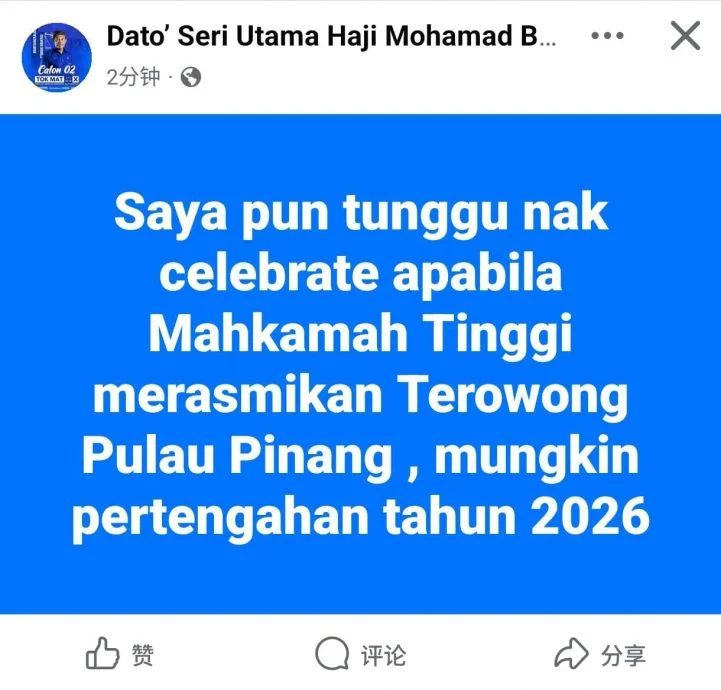 莫哈末哈山在其脸书发文讽刺表示:“我也在等着‘庆祝’,等到高等法院正式宣布槟城海底隧道工程的裁决,或许会是在2026年中。”