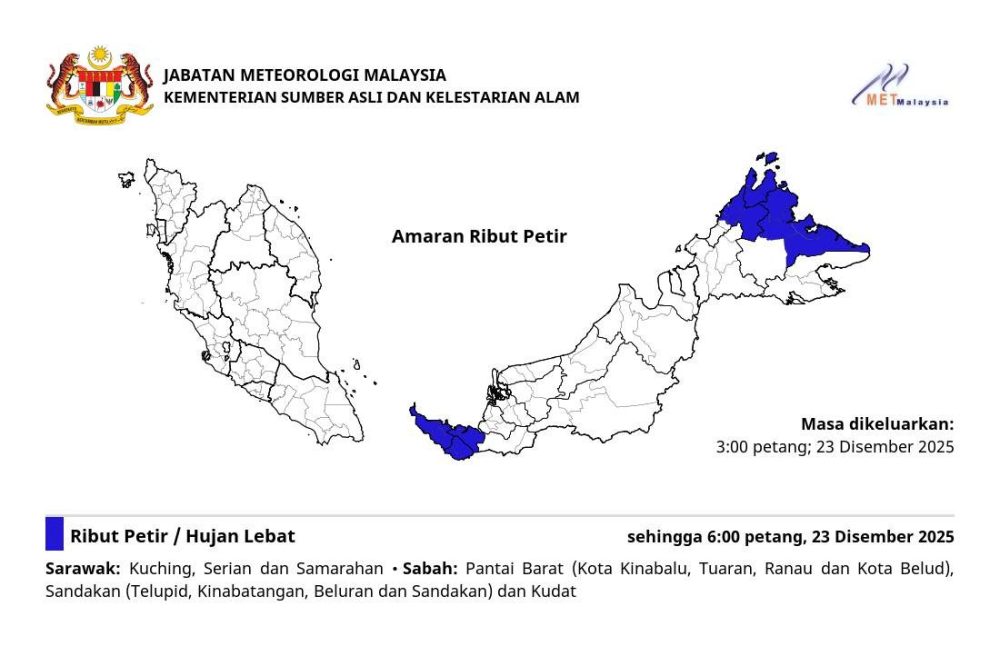 东西马天气不稳,东马居民请注意! 马来西亚气象局于12月23日下午3时正 发布了最新的“雷暴预警”(Amaran Ribut Petir)。 预警指出,砂拉越及沙巴多个地区正遭受雷雨、大雨及阵风袭击,预计恶劣天气将持续至今日(12月23日)傍晚6时正。