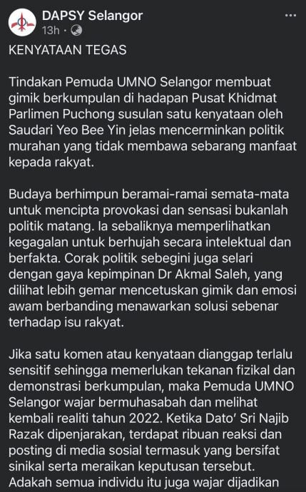 雪社青团透过脸书发表声明,批评雪巫青团在国会议员服务中心前集体造势,只是为了回应杨美盈的一则社交媒体贴文,认为此举毫无建设性,只反映出廉价政治的本质,对人民利益没有任何帮助。