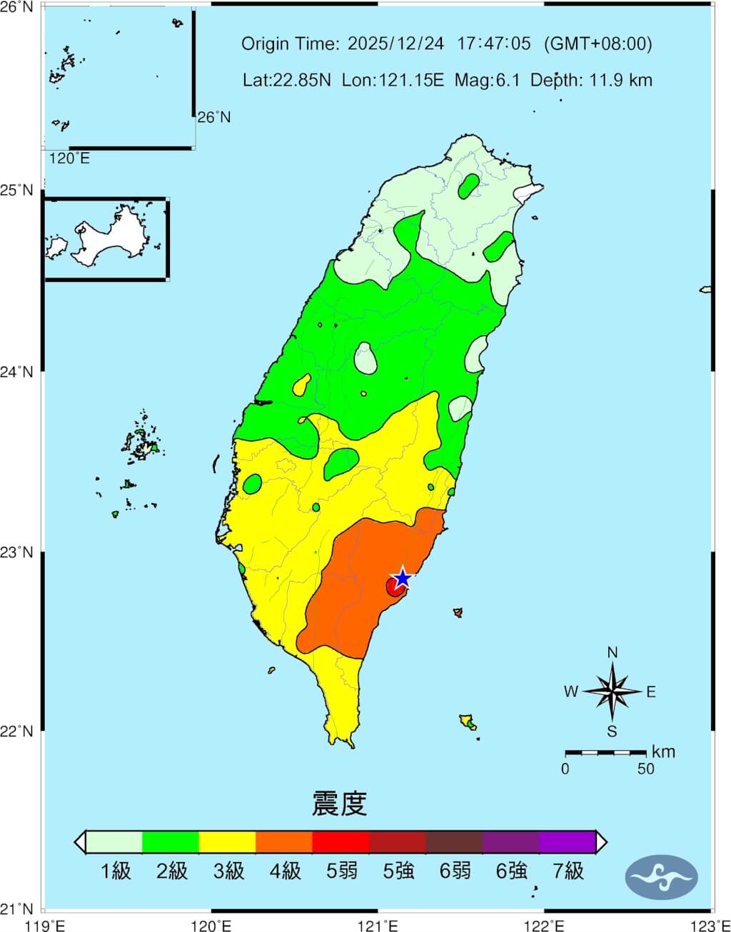 台湾台东县卑南乡于12月24日傍晚5时47分发生6.1级地震,震央位于台东县政府北方约10.1公里处,地震深度为11.9公里,属于极浅层地震,这是今年第153次显着有感地震。