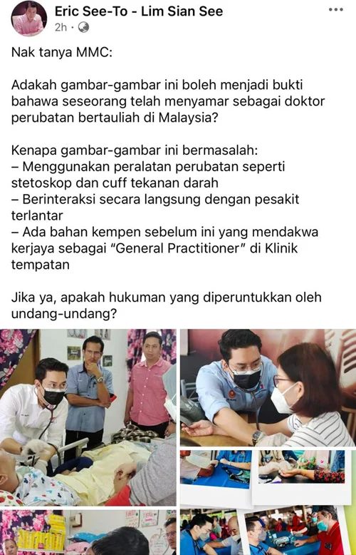 在他所发布的贴文中,司徒忠向大马医药理事会(MMC)提出质疑,询问这些照片是否能够作为证据,证明有人在马来西亚冒充认证医生进行非法行医。他进一步指出,照片中道菲佐哈里与病人近距离接触并使用医疗器材,这引发了更多的疑问。