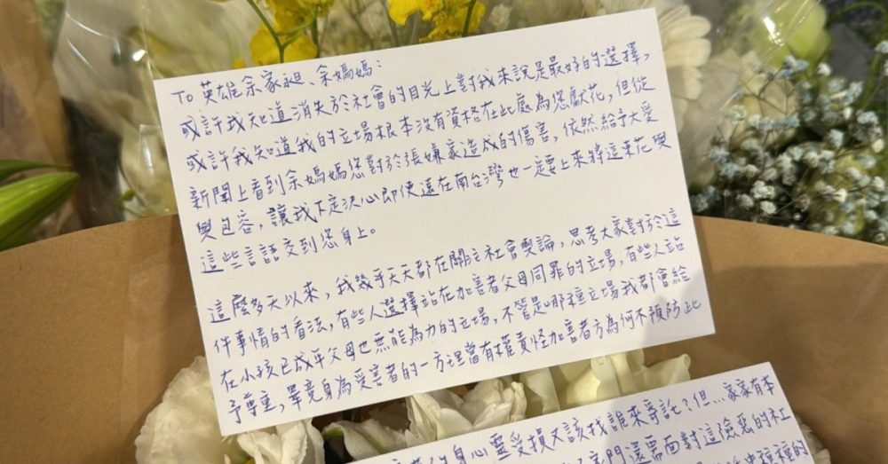 “张嫌兄长”在卡片中透露,尽管自己是此次事件的加害者,但从新闻中看到余母在遭遇张文袭击后依然给予宽容和大爱,这让他深受触动。卡片开头提到,“或许我知道消失于社会的目光对我来说是最好的选择”,但他决定亲自送上花束并写下这封信,表达对余家昶的敬意,并感谢余妈妈对社会的包容与大爱。