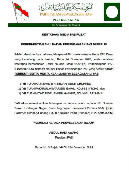 哈迪阿旺在声明中表示,伊斯兰党中央工作委员会已于今日召开会议,决定依据伊斯兰党章(2025年修订)第76条及第15A(1)(b)条文,开除朱宾州议员沙阿舍曼(Sah Asman)、宾洞州议员法克鲁安华(Fakhri Anwar)及莪山芝州议员里祖安哈欣(Rizuan Hasim)的党籍。他指出,党将正式通知玻璃市州议会议长,以履行《玻璃市州政府宪法》(2022年修订)第50A(1)(a)(ii)条文的规定。