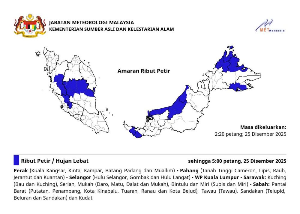 根据气象局于今日下午2时20分发布的通告,半岛多州已被列入雷暴警示范围,包括霹雳州的江沙、近打、金宝、马登巴登及慕阿林;彭亨州的金马仑高原、立卑、劳勿、而连突及关丹;雪兰莪州的乌鲁雪兰莪、鹅唛及乌鲁冷岳,以及吉隆坡联邦直辖区。