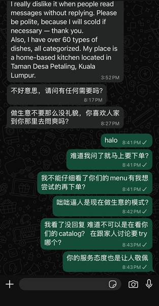 一名网民近日在社交平台发文,分享自己通过 WhatsApp 向一家售卖韩国泡菜的商家询问产品时,因未即时回复讯息,竟被卖家指责“没礼貌”并直接封锁,引发网民热议。
