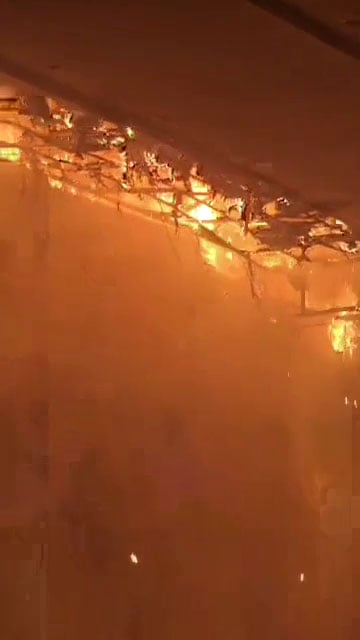 从曝光的画面可见,火势最初仅在屋顶一角冒出小火苗,但短时间内迅速蔓延,火焰沿着天花板扩散,瞬间被浓烟与火光吞没,现场气氛一度相当紧张。