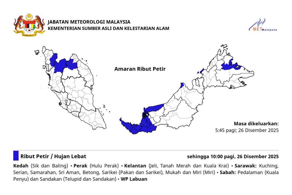 根据大马气象局(MET Malaysia)于12月26日清晨5时45分发布的最新通告,国内部分地区正处于雷暴及大雨风险之中,相关天气状况预计将持续至今早10时。