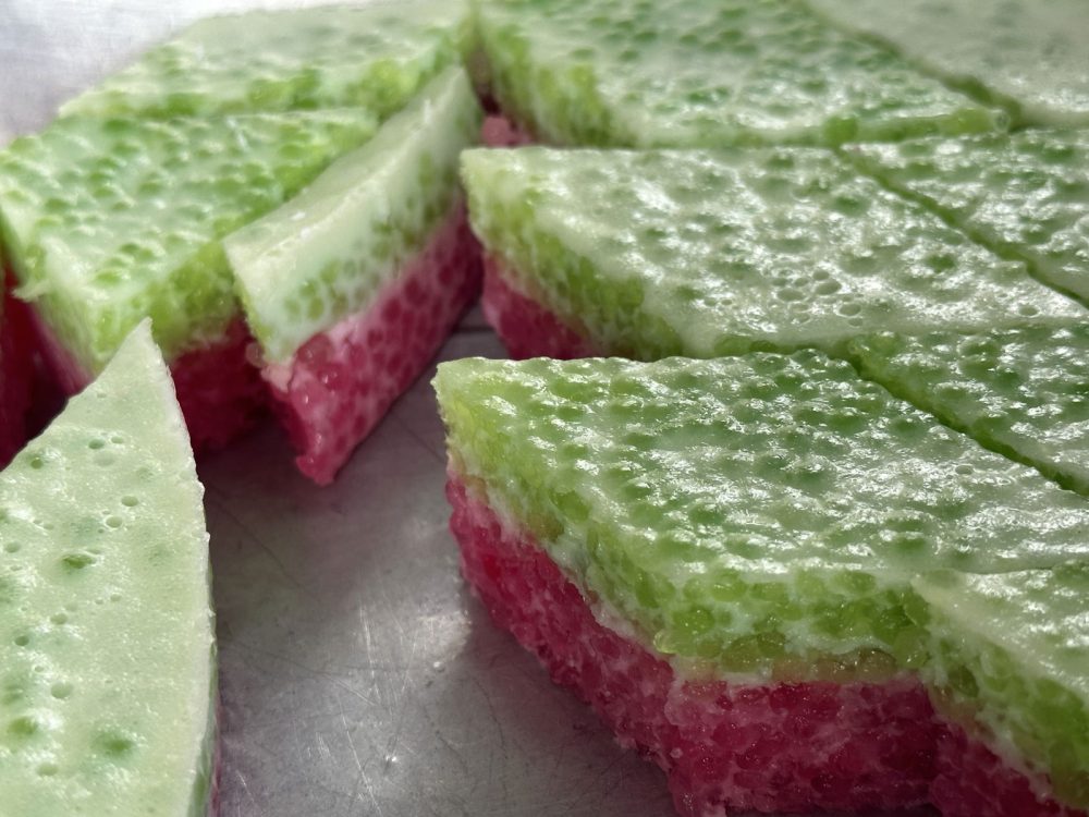“沙谷米糕”则是另一绝。取棕榈科树干内的淀粉(Sago),浸泡让其胀发,加入天然植物染上色再拌以新鲜椰丝和现榨浓郁椰奶蒸熟。切割此糕时还有个小诀窍:在没有保鲜膜的年代,刀面必须抹上一层薄油,方能切出工整利落剖面。