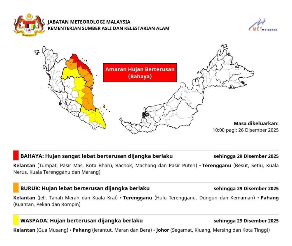 预计持续性大雨将影响以下地区,直至2025年12月29日(星期一):