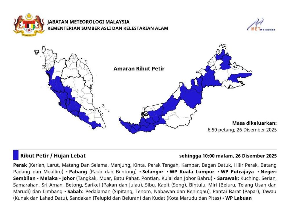 气象单位发布最新警报,预计截至今晚10时(2025年12月26日,星期五),全国多州将出现雷暴、强降雨及强风天气。