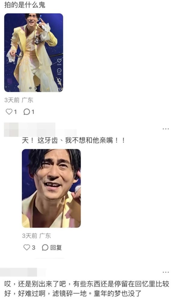 不少粉丝心碎留言表示失望:“有些东西还是留在回忆里比较好”、“童年滤镜碎一地,好难过”、“以前得不到的男人,现在也不想要了”、“怎么看起来有点油腻”、“老人味好重”、“牙齿怎么这么黑”、“为什么唱歌还要插鼻孔”。